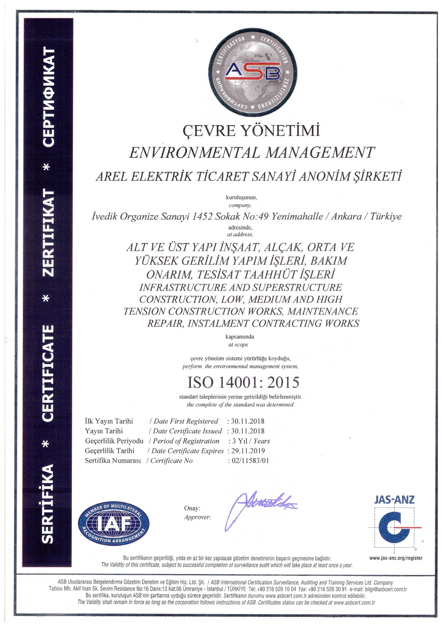 AREL üretim aşamalarının kontrolü ve en yüksek seviyede bir standardizasyona ulaşması için ISO 14001 belgesi sahibidir. Bu standardın getirdiği bütün yaklaşımlara uyarak müşterilerinin en iyi sonuçları almasını destekler.