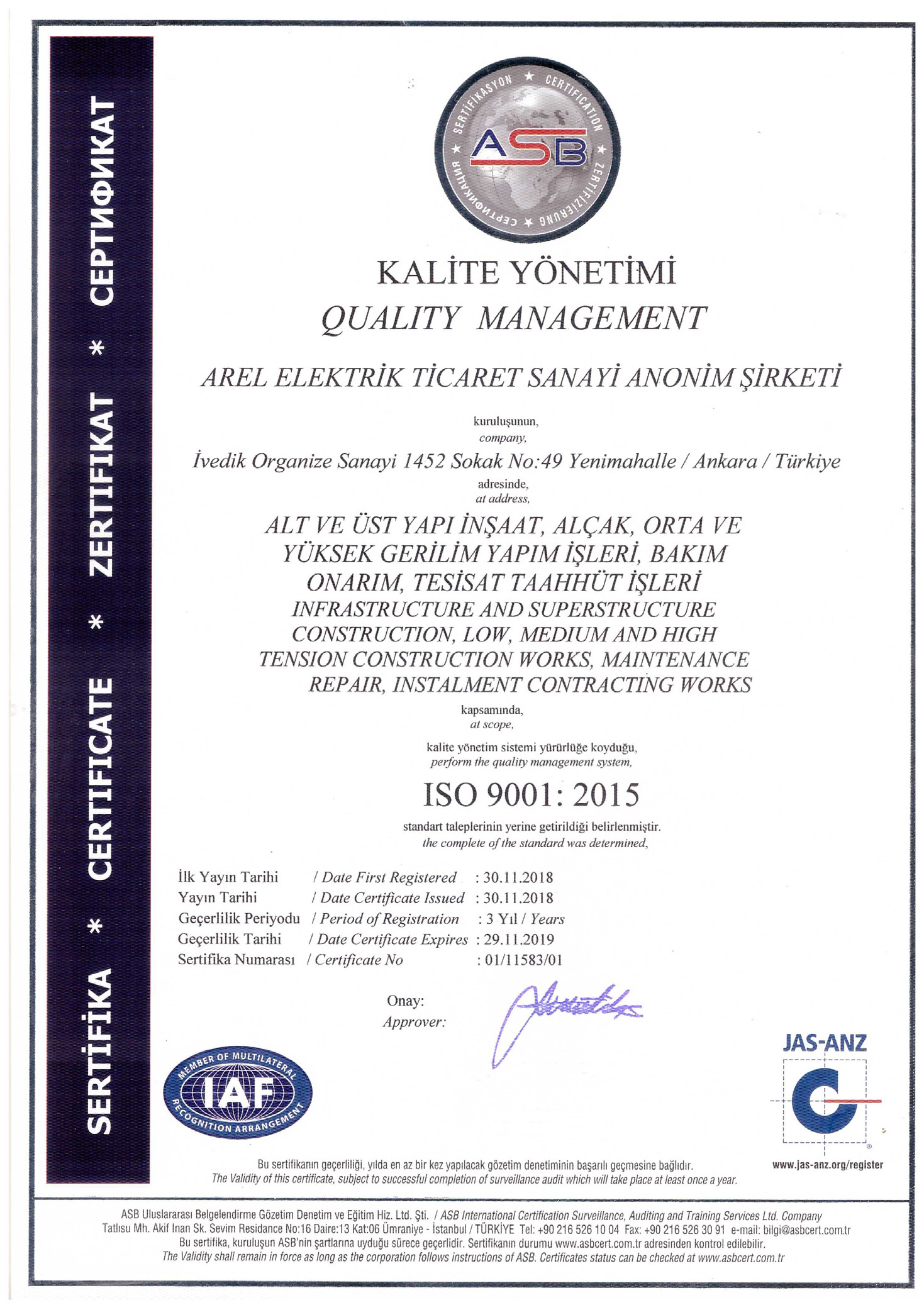 AREL hizmet verdiği her alanın yönetimsel olarak en yüksek kalite düzeyinde bulunup bunun bir standart olarak devam ettirilebilmesi için ISO 9001 belgesine sahiptir. Yönetimsel olarak benimsediği ISO ilkeleri müşterilerinin en iyi sonuçları almasını destekler.